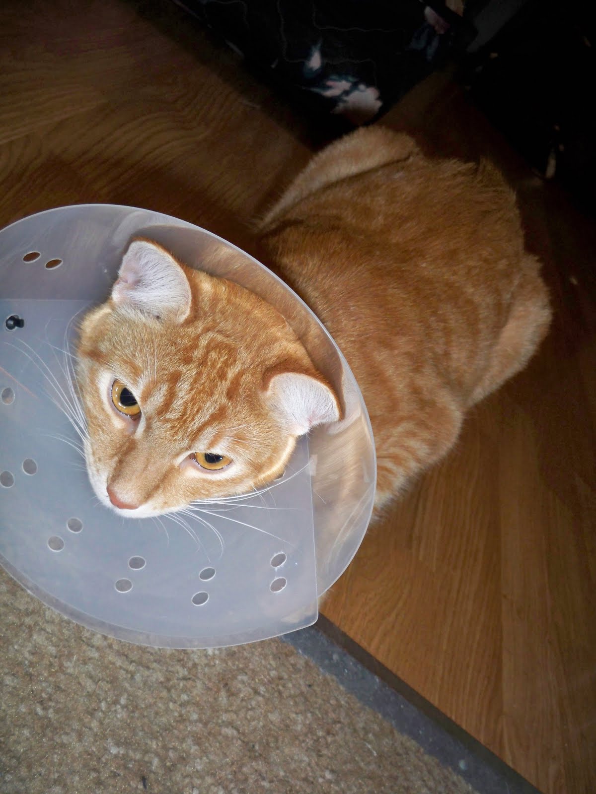 Emily brought home one of those Elizabethan collars for the cat to prevent him from licking the huge gash on the side of the chest. He looks pathetic but hopefully it does the job.
