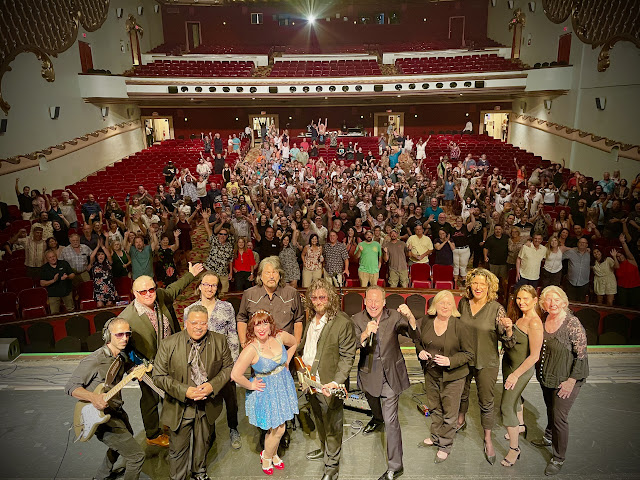 We hop on the stage and do our show – this time with a much needed intermission – enough time to change some batteries and snap a group shot outside the theater’s marquee. Even though it was not a sold out show the energy from the crowd is magnetic. Security has to keep directing people away from the orchestra pit.